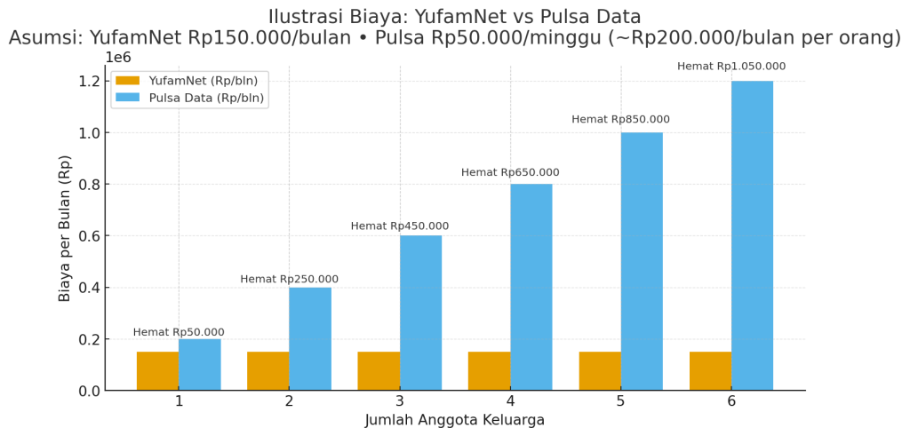 Catatan: Dengan rata-rata 4,33 minggu/bulan, biaya pulsa ≈ Rp216.667/orang/bulan—hasilnya tetap menunjukkan YufamNet lebih hemat, dan hematnya makin besar untuk keluarga >2 orang.